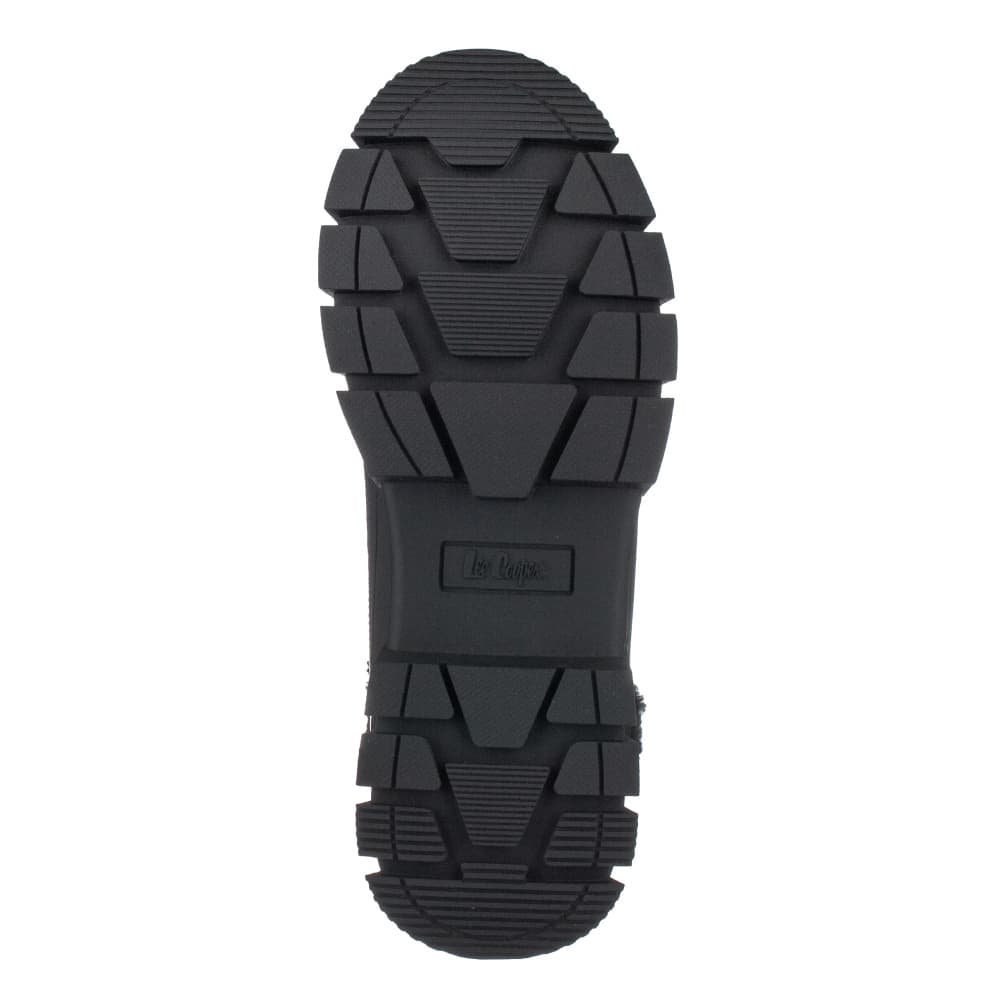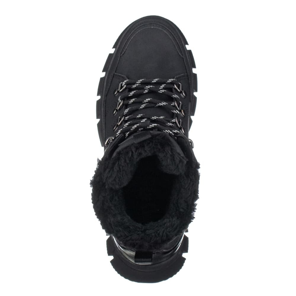 Trendová kotníčková obuv LEE COOPER ze syntetické kůže imitující nubuk v černé barvě zdobená kožešinovým límečkem na horním okraji uzavíraná šněrováním. Uvnitř je obuv vyteplena textilním kožíškem a zateplenou vyměkčenou stélkou.