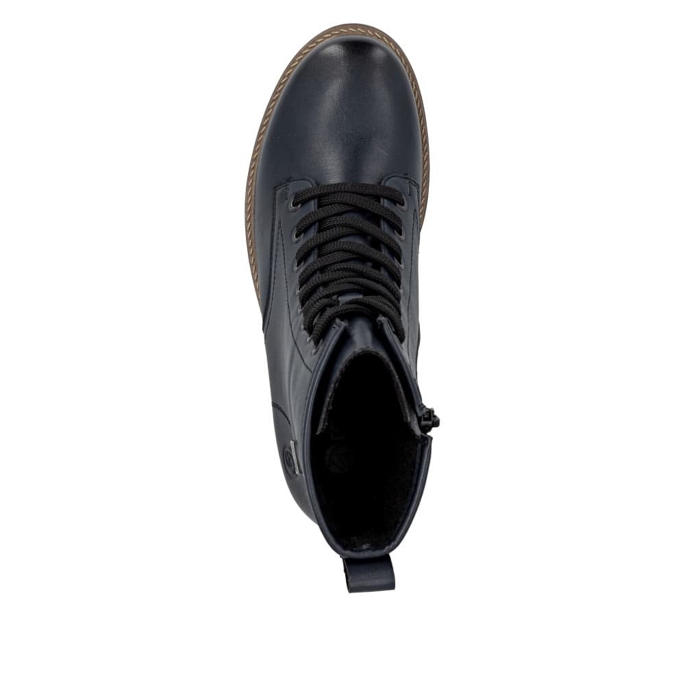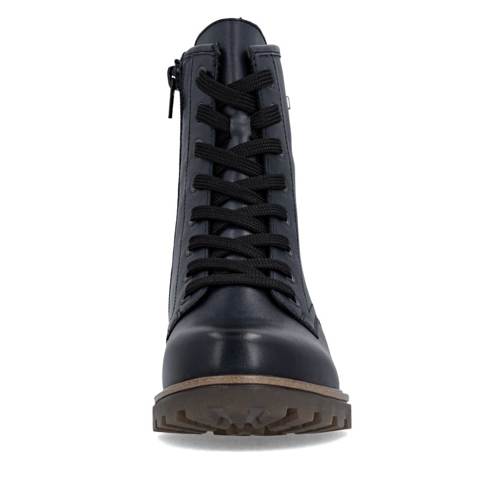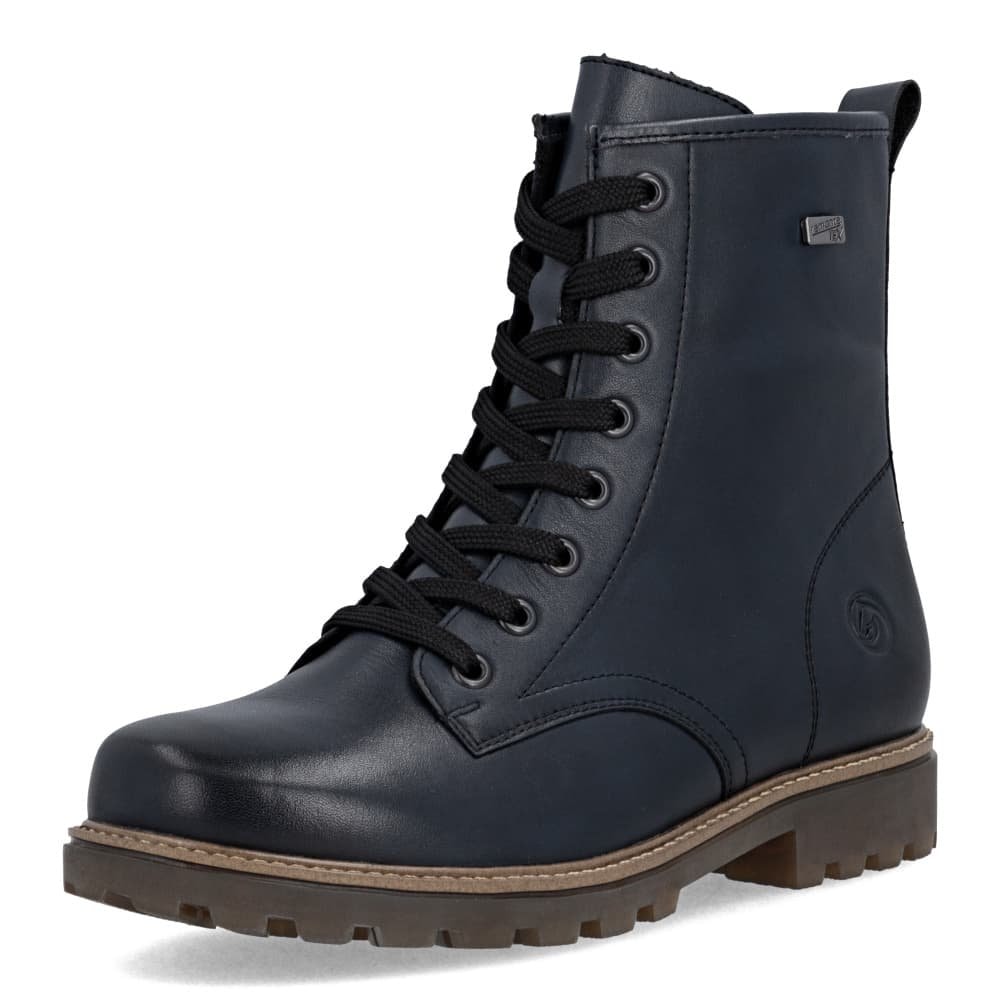 Kotníčková obuv REMONTE v kombinaci hladké a syntetické kůže v temně modré barvě. Obuv je lehce zateplena příjemnou fleecovou textilní podšívkou a vyjímatelnou vyměkčenou stélkou. Zapínání obuvi je na zip na vnitřní straně, předním šněrováním je možné obuv přizpůsobit objemu nártu a kotníku. Obuv je vybavena membránou REMONTE TEX a je výrobcem deklarována jako „obuv do každého počasí“ – voděodolnost, výborná ochrana proti chladu, při současném zachování prodyšnosti obuvi a pohodlí při nošení. Obuv je šita komfortním systémem, který nabízí pohodlnou šíři obuvi, lehkou flexibilní podešev a také vyjímatelnou stélku, která při chůzi absorbuje otřesy na páteř a klouby.