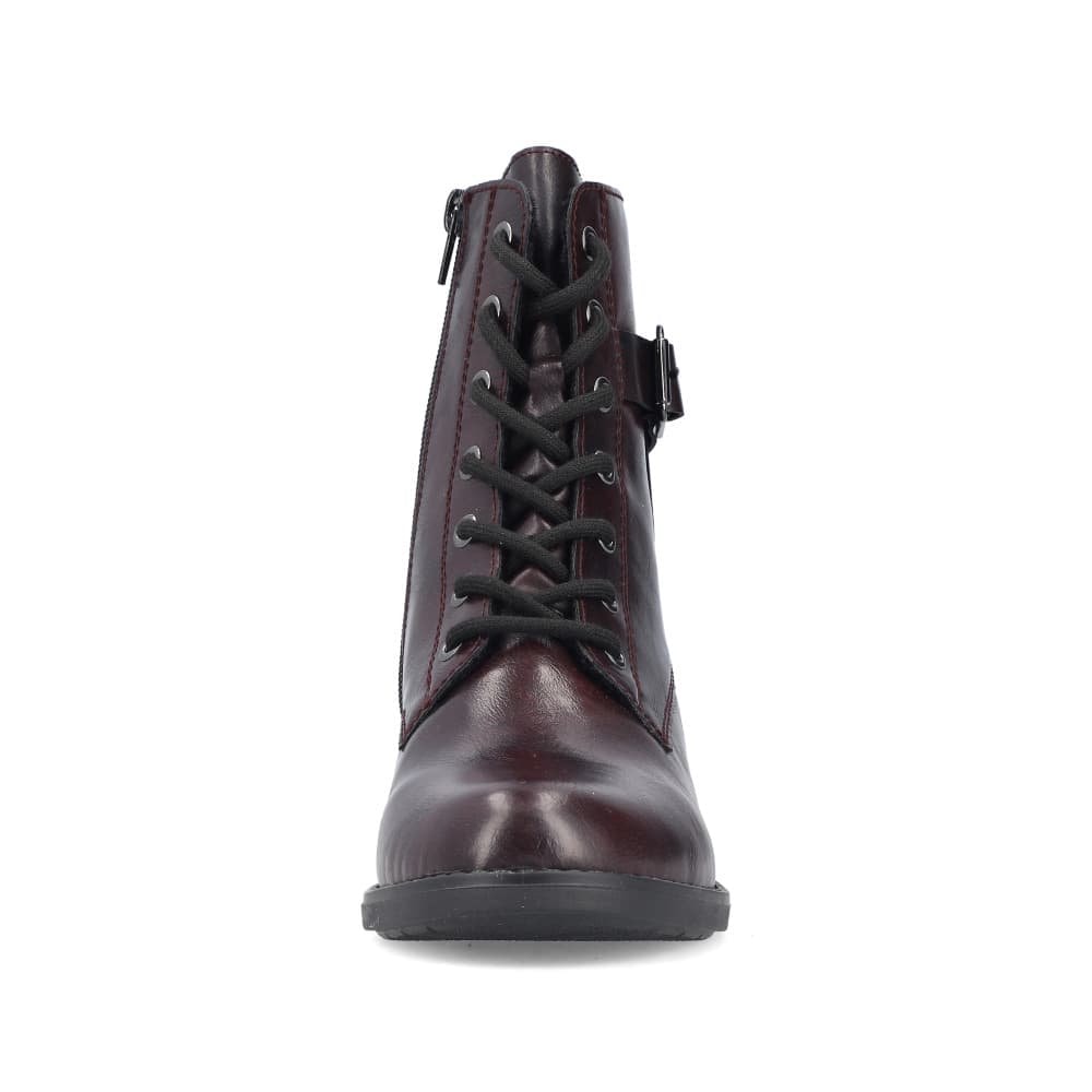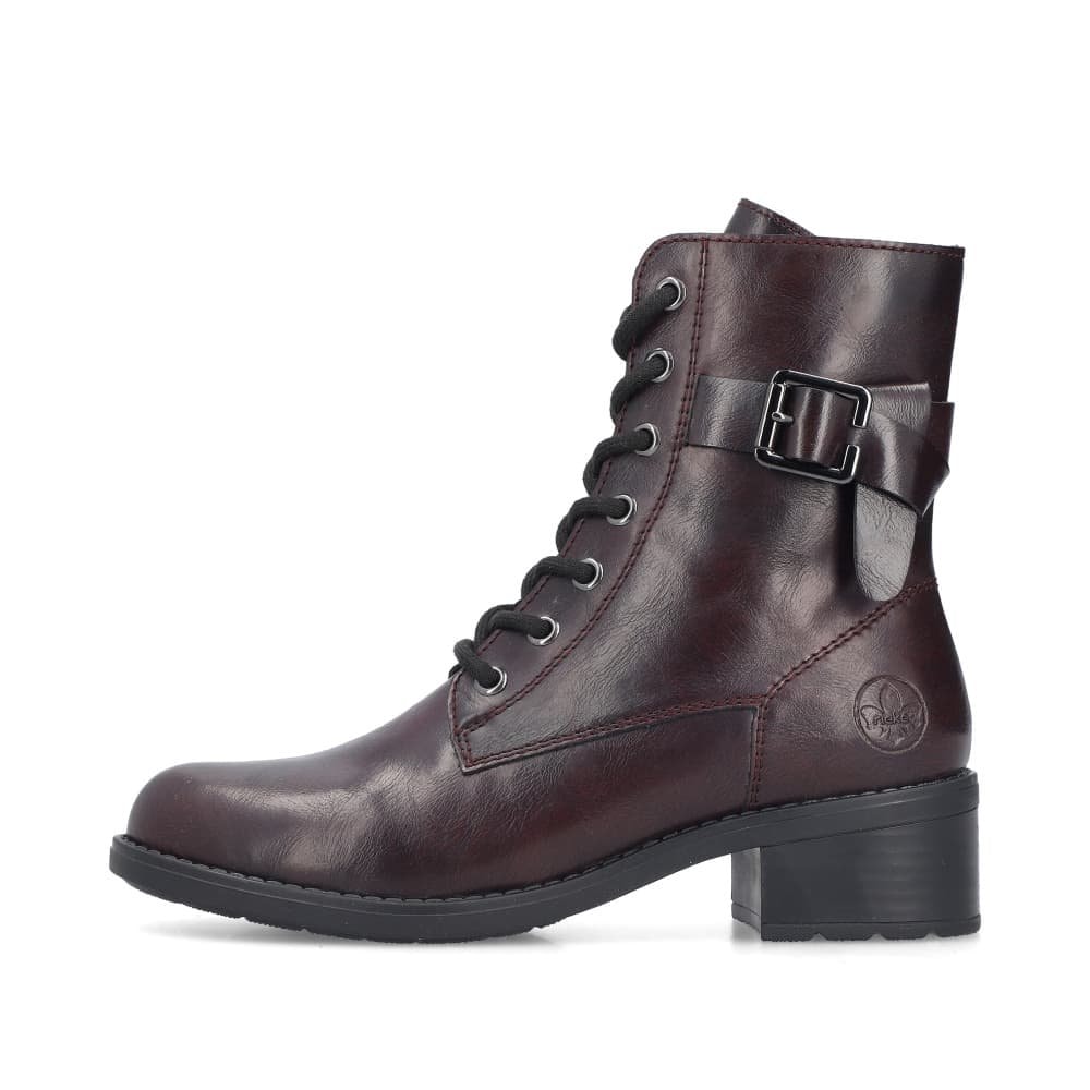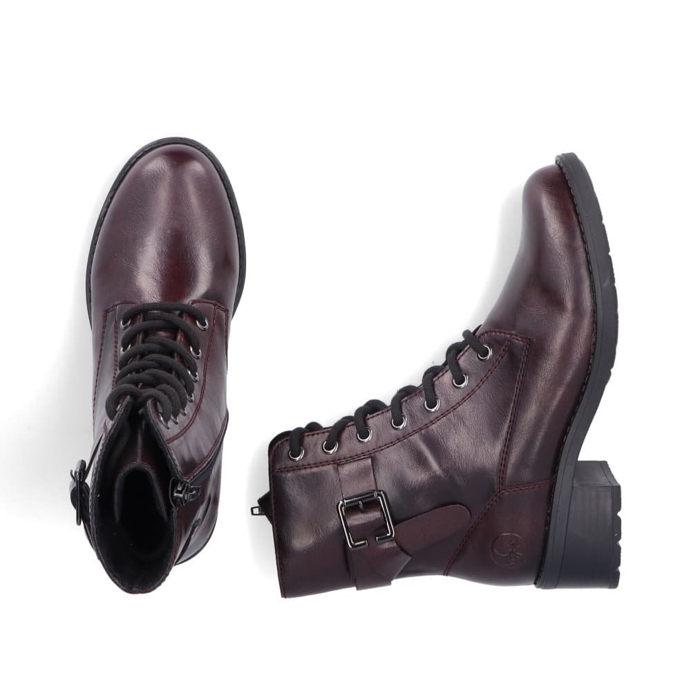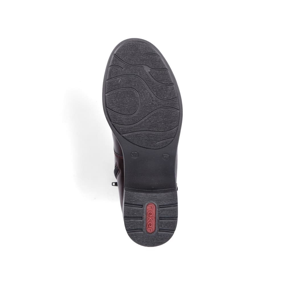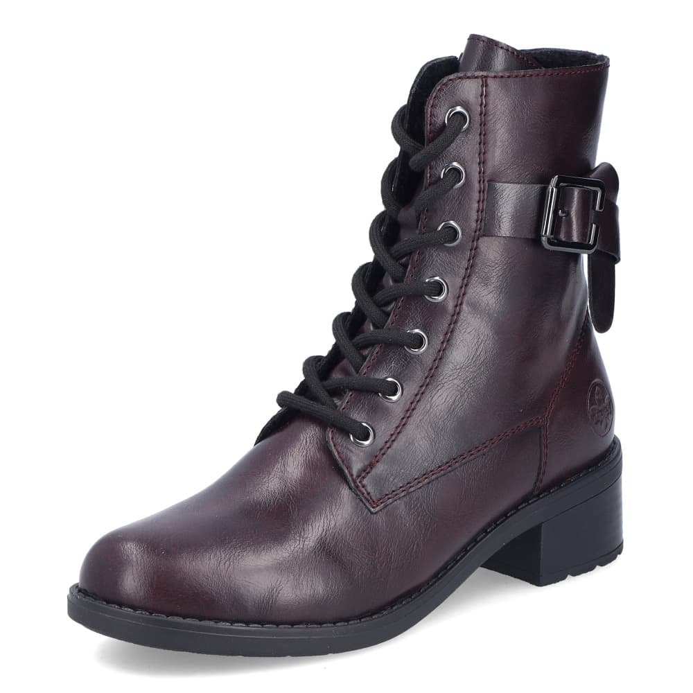 Kotníčková obuv RIEKER ze syntetické kůže ve vínové barvě. Zapínání obuvi je na zip na vnitřní straně, předním šněrováním je možné obuv přizpůsobit objemu nártu a kotníku. Je zateplena příjemnou fleecovou textilní podšívkou a vyjímatelnou vyměkčenou stélkou. Obuv Rieker je vyrobena speciální technologií Antistress poskytující lehkost a ohebnost obuvi, dostatečný vnitřní prostor a absorbci nárazů a otřesů na páteř při chůzi.