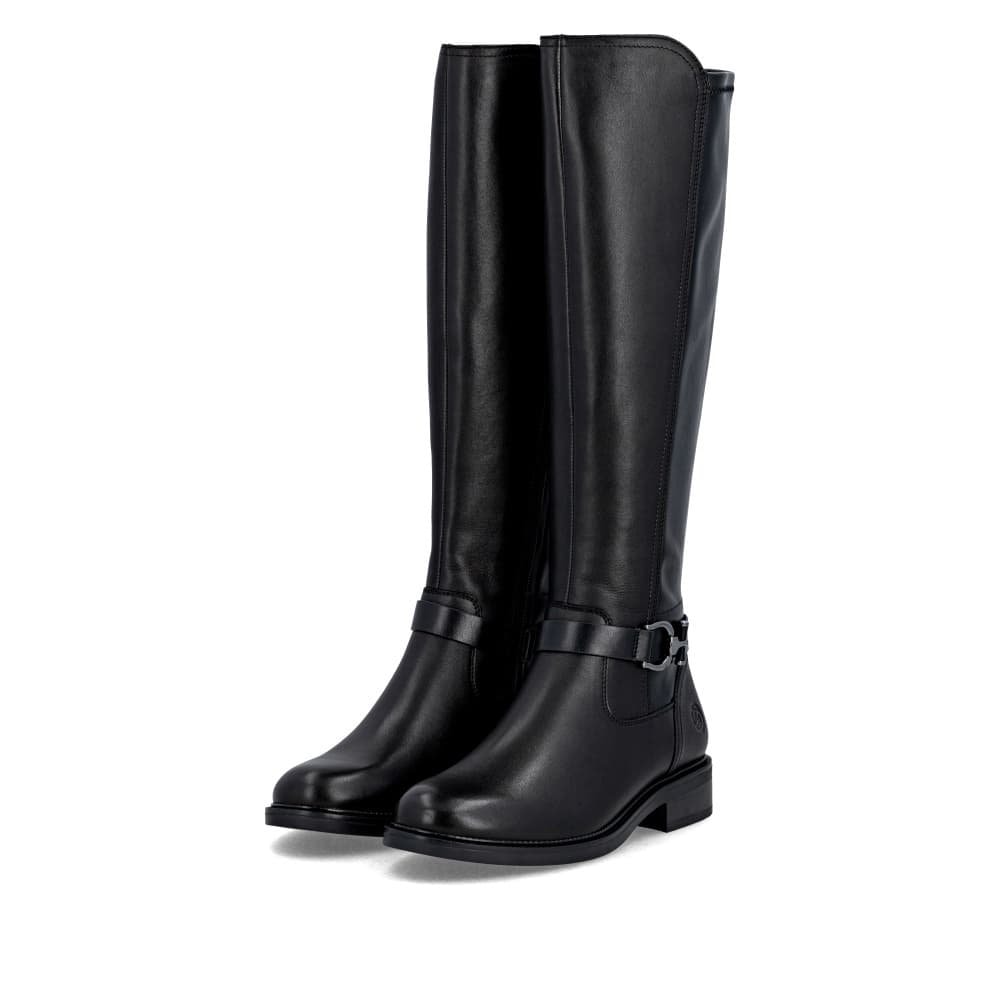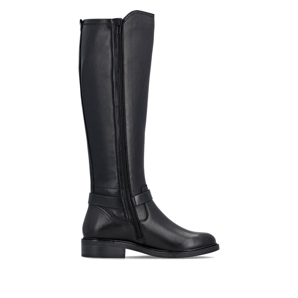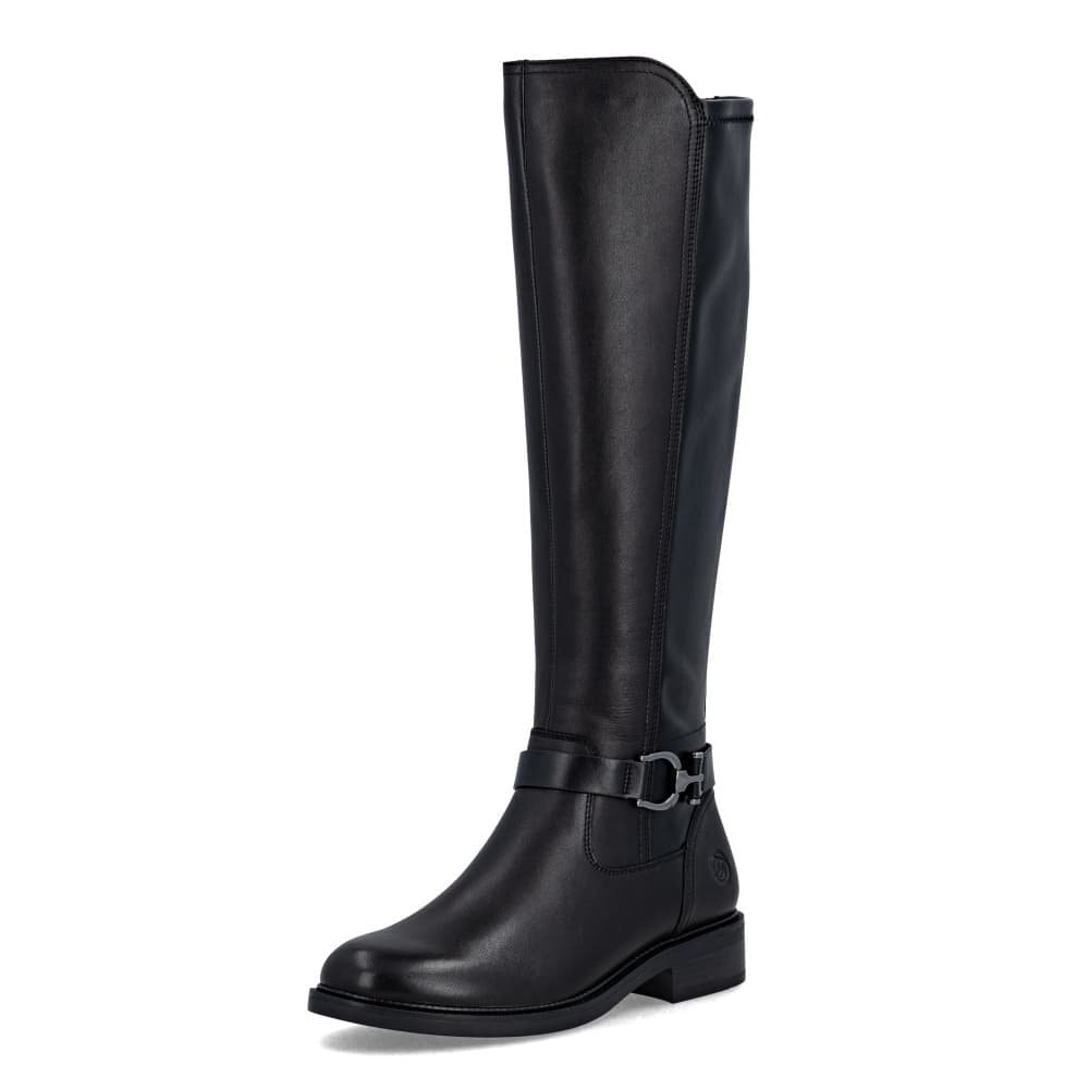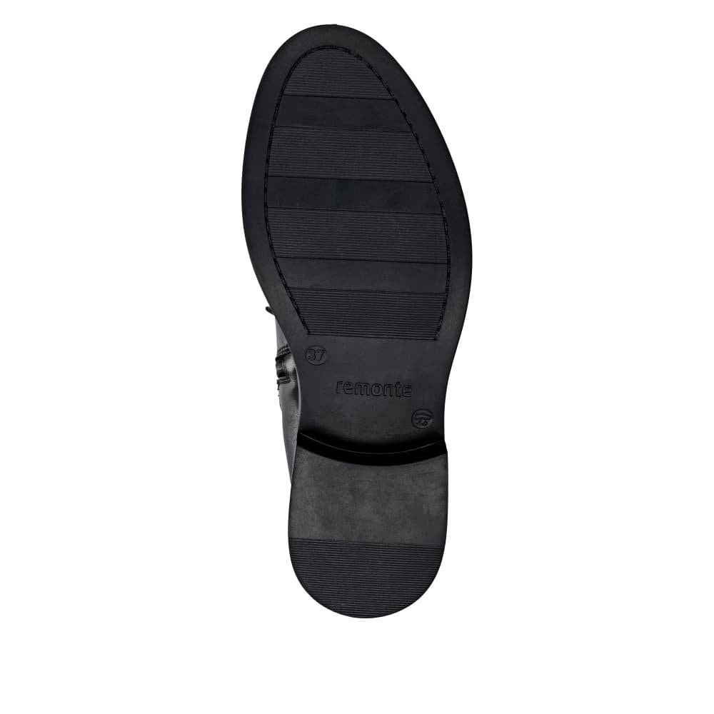 Kozačky REMONTE v kombinaci hladké kůže a syntetického materiálu v černé barvě ve střihu Vario - celá délka lýtkové části je ze strečového materiálu, který se dokonale prizpůsobí tvaru lýtka. Obuv je lehce vyteplena příjemnou textilní fleecovou podšívkou a je vybavena vyměkčenou vyjímatelnou stélkou. Zapínání obuvi je na zip na vnitřní straně. Obuv je šita komfortním systémem, který nabízí pohodlnou šíři obuvi, lehkou flexibilní podešev a také vyjímatelnou stélku, která při chůzi absorbuje otřesy na páteř a klouby. Výška kozačky po lýtku od paty je cca 40 cm, obvod lýtka je cca 36 - 38 cm.