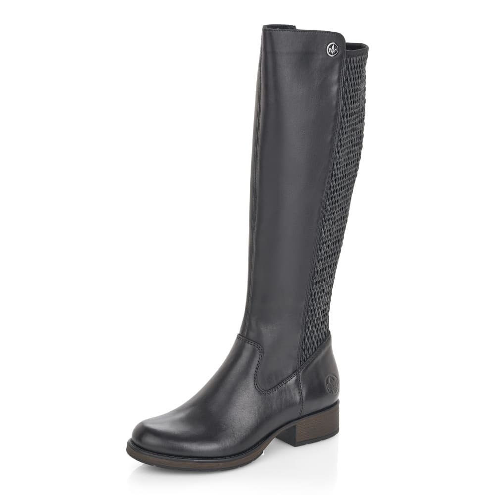 Kozačky RIEKER z hladké kůže v kombinaci se syntetickým materiálem v černé barvě ve střihu Vario - celá délka lýtkové části je ze strečového ozdobného materiálu, který se dokonale přizpůsobí tvaru lýtka. Obuv je lehce vyteplena příjemnou textilní fleecovou podšívkou a vlepenou vyměkčenou filcovou stélkou. Zapínání obuvi je na zip na vnitřní straně. Výška kozačky po lýtku od paty je cca 37 cm, obvod lýtka je cca 36 - 40 cm. Obuv Rieker je vyrobena speciální technologií Antistress poskytující lehkost a ohebnost obuvi, dostatečný vnitřní prostor a absorbci nárazů a otřesů na páteř při chůzi.