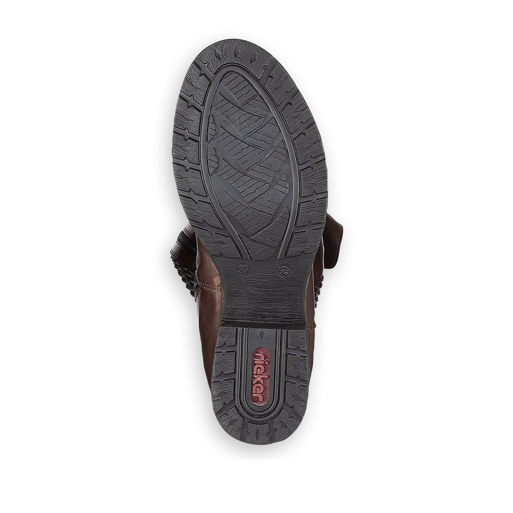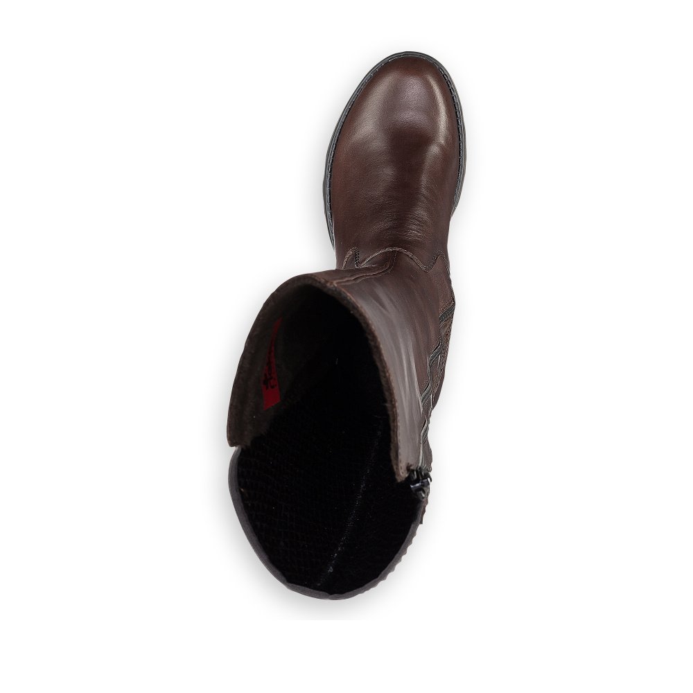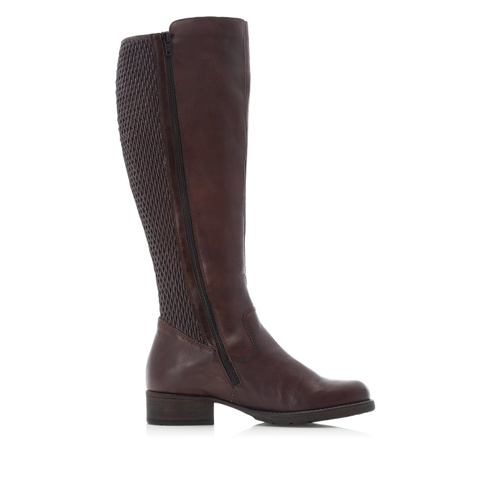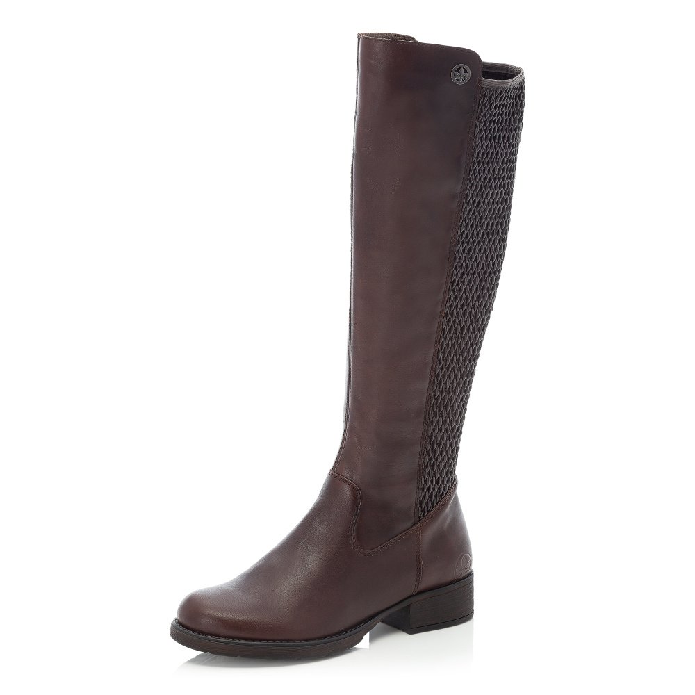 Kozačky RIEKER z hladké patinované kůže v kombinaci se syntetickým materiálem v temně hnědé barvě ve střihu Vario - celá délka lýtkové části je ze strečového materiálu, který se dokonale prizpůsobí tvaru a objemu lýtka. Obuv je lehce vyteplena příjemnou textilní fleecovou podšívkou a vlepenou vyměkčenou filcovou stélkou. Zapínání obuvi je na zip na vnitřní straně. Výška kozačky po lýtku od paty je cca 37 cm, obvod lýtka je cca 36 - 40 cm. Obuv Rieker je vyrobena speciální technologií Antistress poskytující lehkost a ohebnost obuvi, dostatečný vnitřní prostor a absorbci nárazů a otřesů na páteř při chůzi.