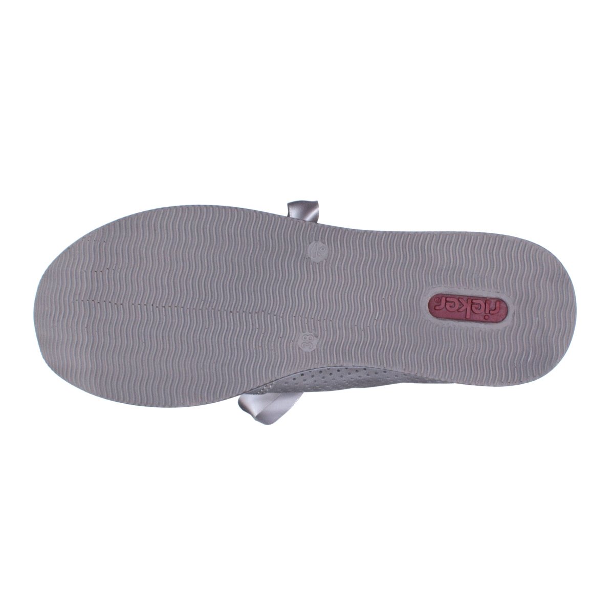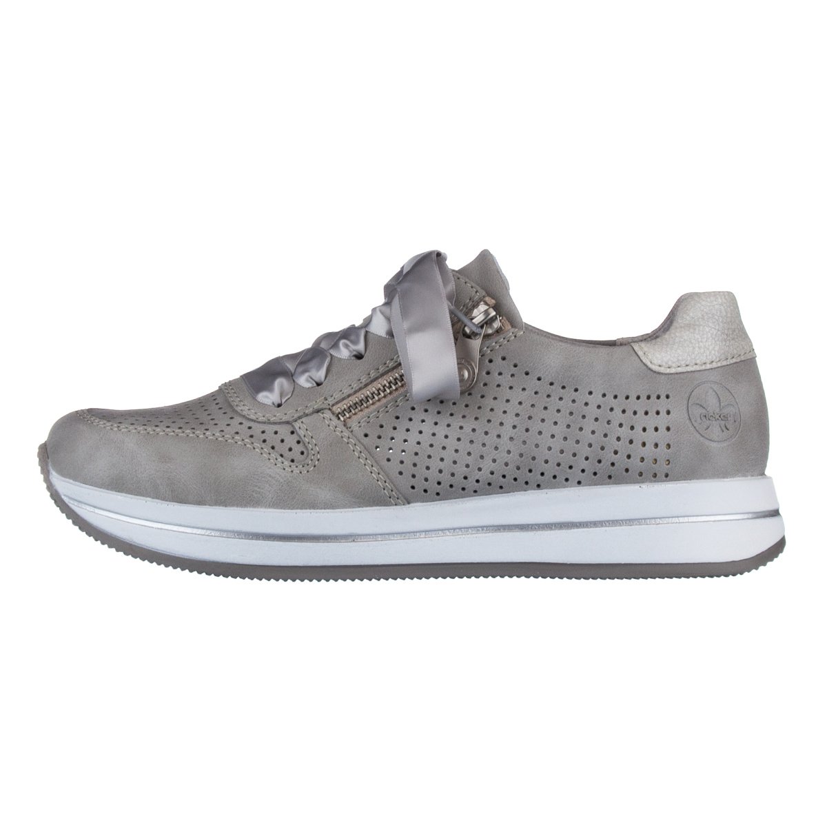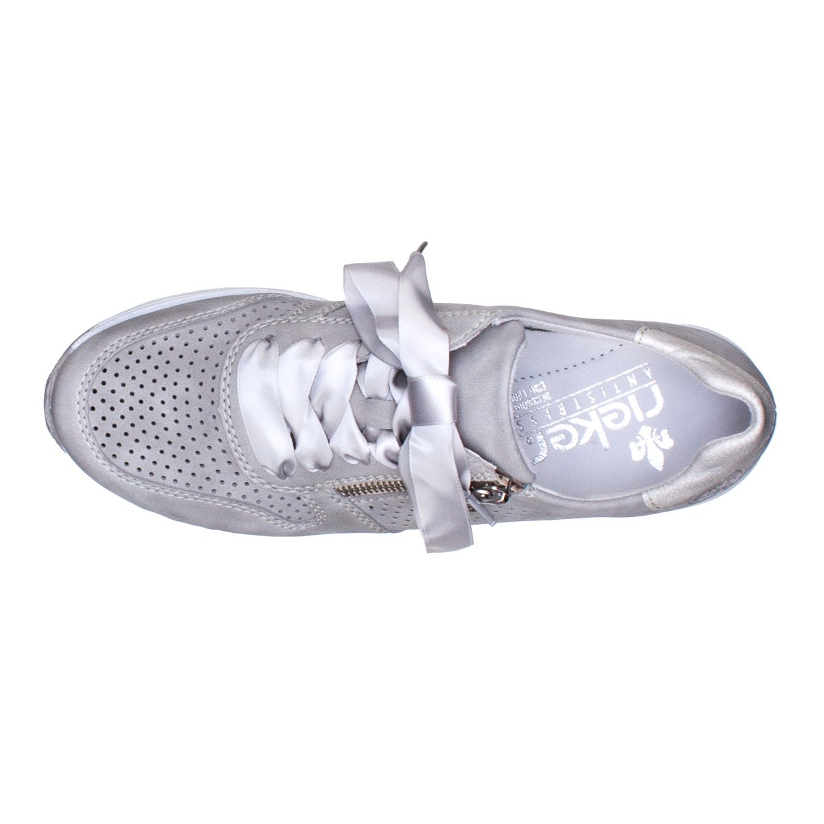 Polobotky RIEKER sportovního vzhledu na 2,5 cm platformě ze syntetické kůže imitující nubuk v šedé barvě zdobené perforací. Zapínání obuvi je na zip na vnější straně, předním šněrováním je možné obuv přizpůsobit objemu nártu. Uvnitř silně vyměkčená kožená vkládací stélka. Obuv Rieker je vyrobena speciální technologií Antistress poskytující lehkost a ohebnost obuvi, dostatečný vnitřní prostor a absorbci nárazů a otřesů na páteř při chůzi.