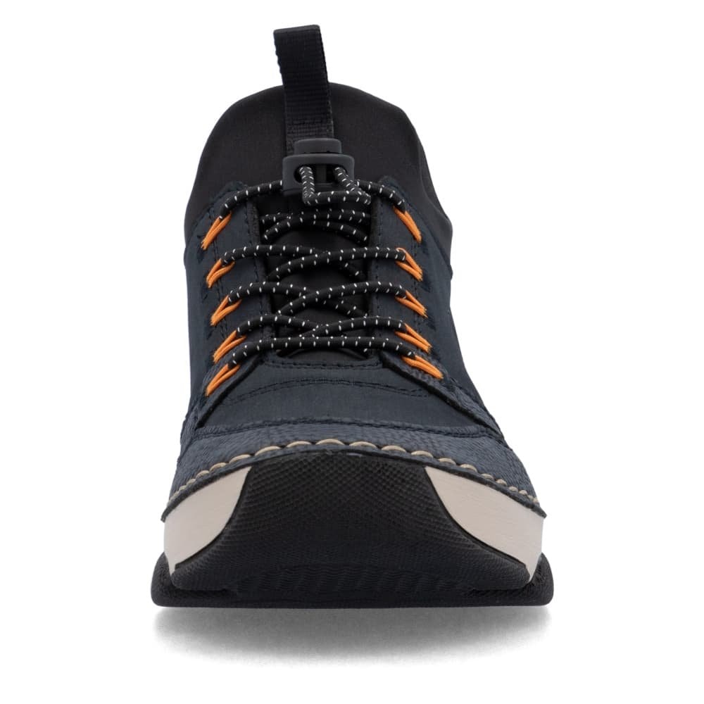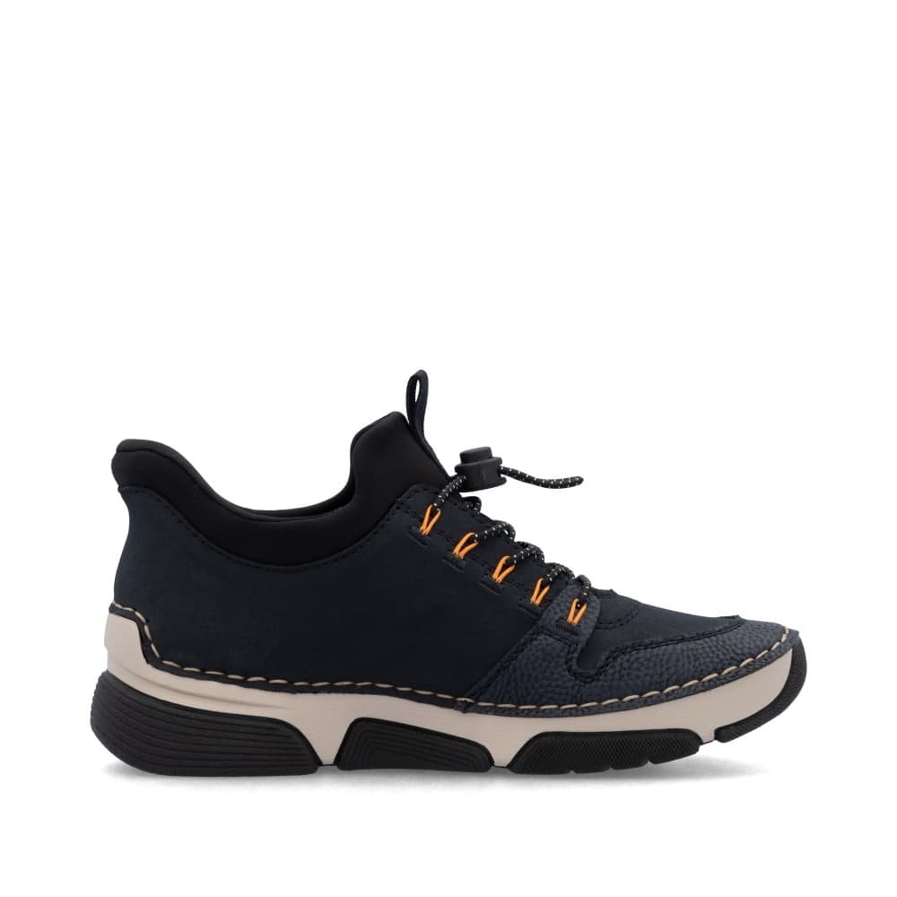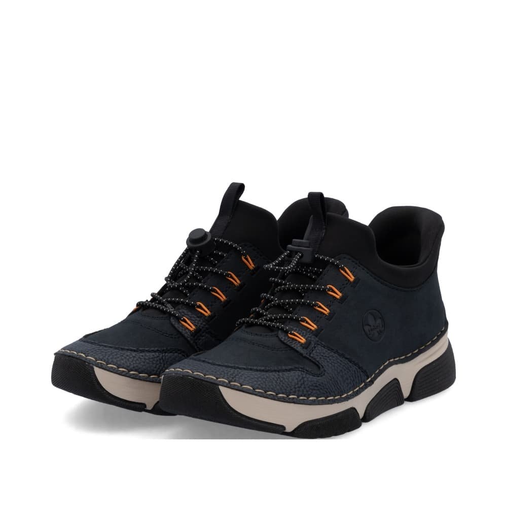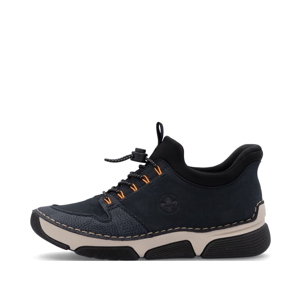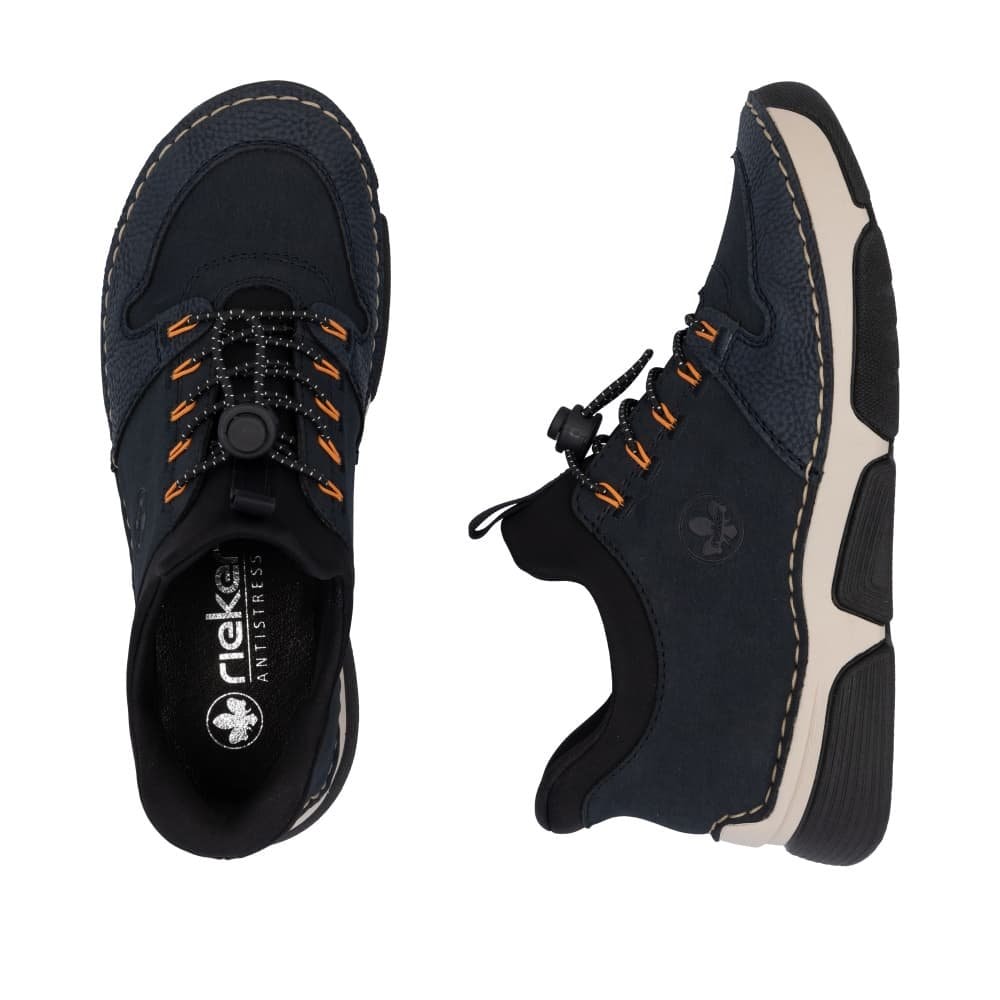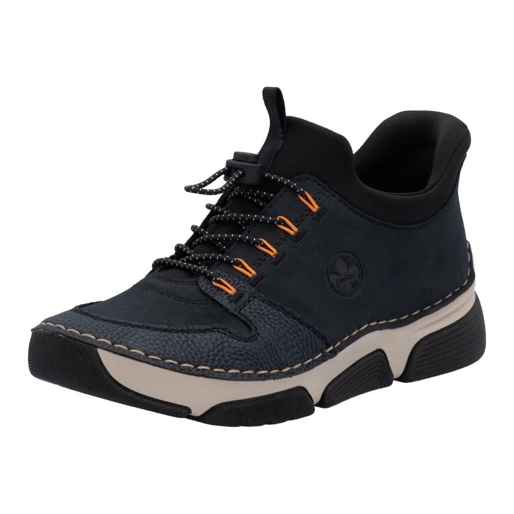Prozouvací tenisky RIEKER v kombinaci syntetické kůže imitující nubuk a textilního materiálu v temně modré barvě. Pružné gumičky v oblasti nártu umožňují přizpůsobení se noze podle potřeby. Vnitřek obuvi je podšitý příjemnou měkkou textilní podšívkou. Uvnitř je extrémně měkká kožená stélka. Obuv Rieker je vyrobena speciální technologií Antistress poskytující lehkost a ohebnost obuvi, dostatečný vnitřní prostor a absorbci nárazů a otřesů na páteř při chůzi.